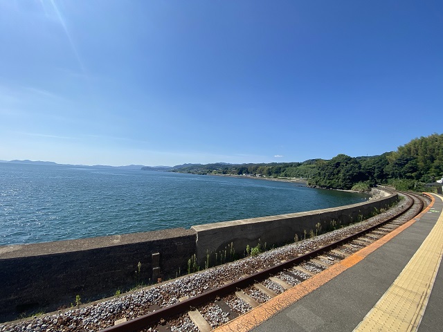長崎県の千綿駅(ちわたえき) 。大村湾を一望できる線路。暑さも吹き飛ぶ美しさでした