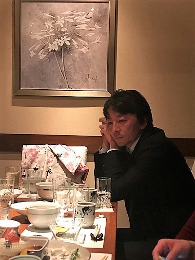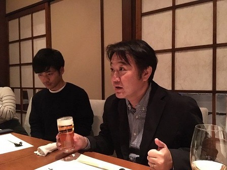 乾杯の挨拶で、沙喜代アナを慰労する伊藤拓アナウンサーと、