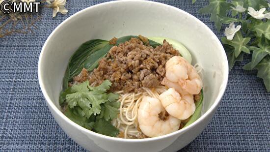 6.器に茹でた温麺を入れ、スープ、炒めたひき肉、チンゲン菜とえびを