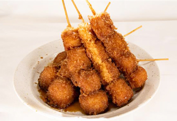 ジャガイモを一度蒸しひと口大にカットし串に刺して衣をつけ、あぶらで揚げ特製のフルーツソースをかけたものです。 カリッとほくほくのいもフライをめしあがれ♬