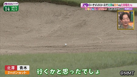 バンカーショットを避けて残り70ヤードの距離は残っていますが、秀ちゃんのボールを選択したミヤテレスタジアムチーム。