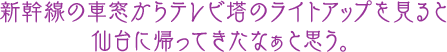 仙台市太白区の大年寺山にある三本のテレビ塔は、平成19年度の仙台市都市景観賞・都市景観大賞に選ばれました。そのうちのひとつ、ミヤギテレビの「ミヤテレタワー」は夜間のライトアップの色で明日の天気をお知らせしています。